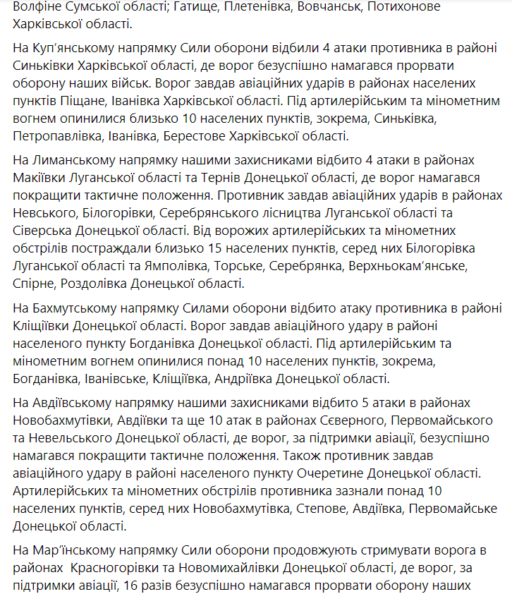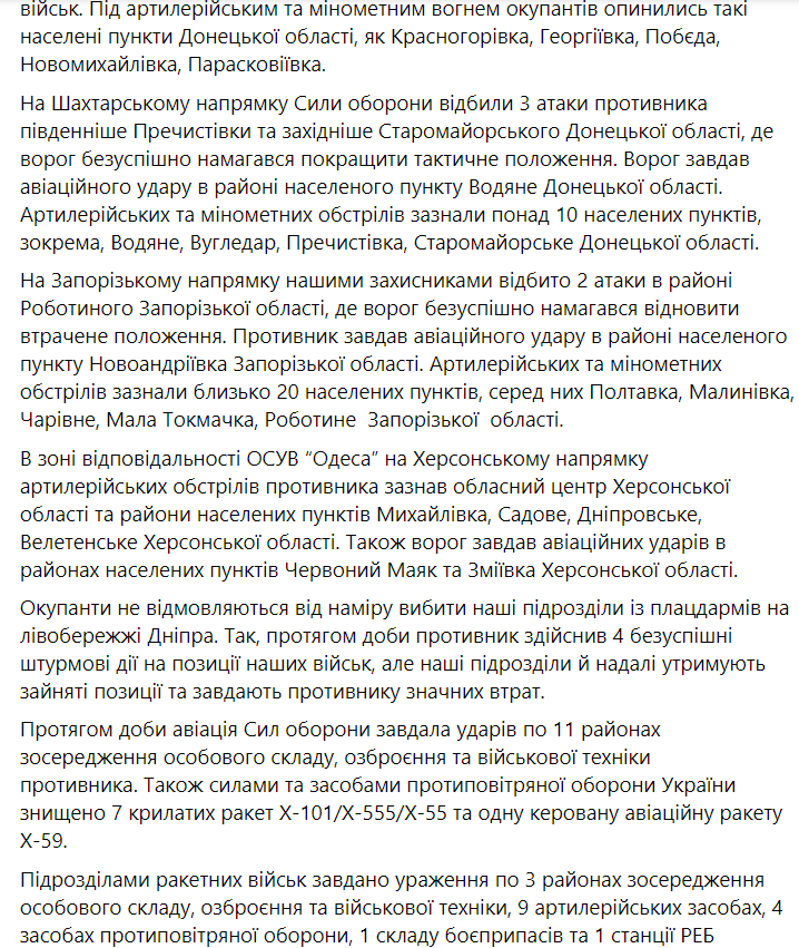 Авиация Сил обороны нанесла удары по 11 районам сосредоточения личного состава, вооружения и военной техники противника. Также силами и средствами противовоздушной обороны Украины уничтожены семь крылатых ракет Х-101/Х-555/Х-55 и одна управляемая авиационная ракета Х-59. Подразделениями ракетных войск нанесен удар по трем районам сосредоточения личного состава, вооружения и военной техники, девяти артиллерийским средствам, четырем средствам противовоздушной обороны, одному составу боеприпасов и одной станции РЭБ противника.