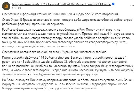 114 боевых столкновений за сутки. Сводка Генштаба ВСУ на вечер 18 января