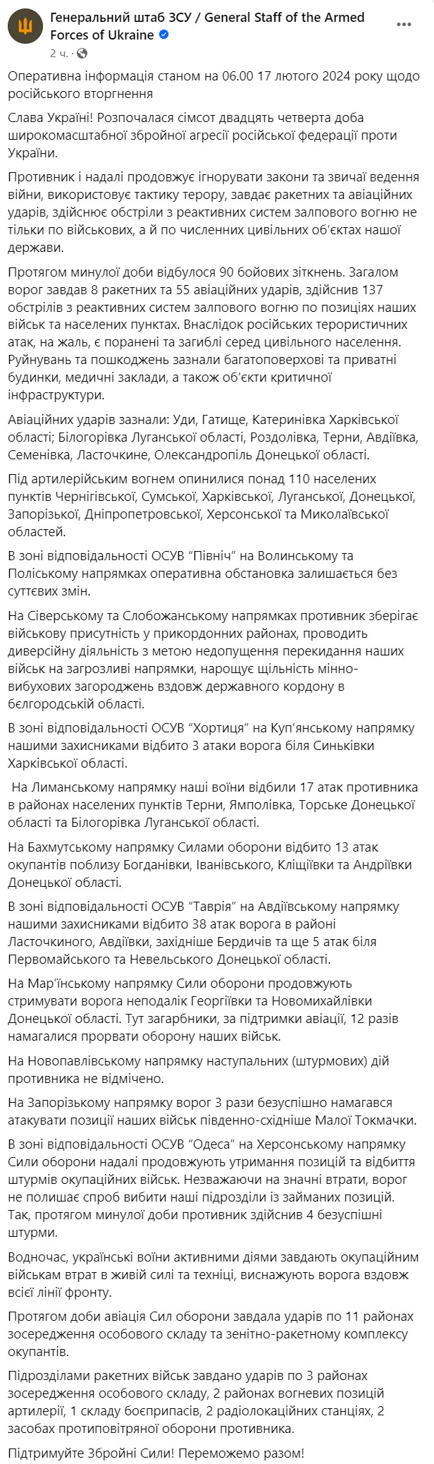 За прошедшие сутки произошло 90 боевых столкновений. Всего РФ нанесла 8 ракетных и 55 авиационных ударов, совершила 137 обстрелов из РСЗО по позициям наших войск и населенным пунктам.