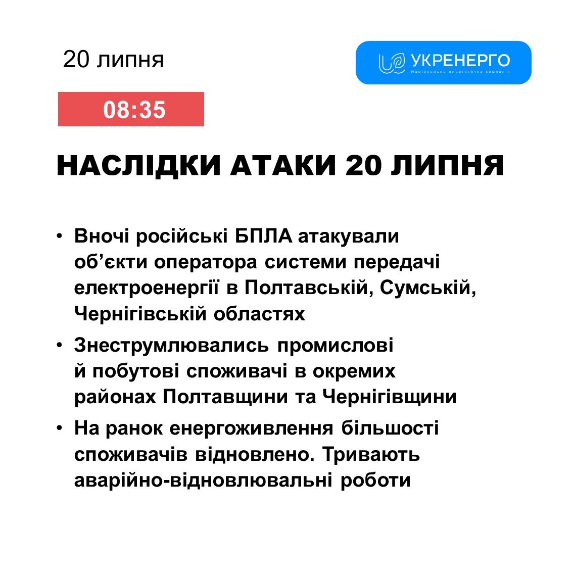 Также пострадали системы передачи электроэнергии в Полтавской и Черниговской областях.