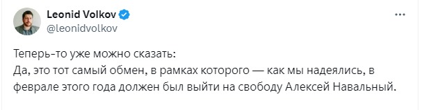 "Да, это тот самый обмен, в рамках которого — как мы надеялись, в феврале этого года должен был выйти на свободу Алексей Навальный", — сообщил Волков.