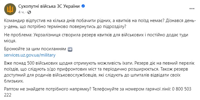 Забронировать билет можно по ссылке: services.uz.gov.ua/military
