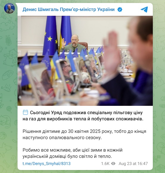 "Сегодня правительство продлило специальную льготную цену на газ для производителей тепла и бытовых потребителей. Решение будет действовать до 30 апреля 2025 года, то есть до конца следующего отопительного сезона", - сказано в публикации.