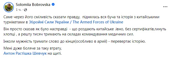 "Именно из-за его смелости сказать правду поднялась вся буча и история с китайскими турникетами в Вооруженных силах Украины. Он просто сказал, как было на самом деле: что раздают китайское говно без сертификатов, погибают ребята, а остальные тысячи держат на складах командование медицинских сил. Иногда мужество держать слово до конца (особенно в армии) переворачивает историю", - сказано в публикации нардепа.