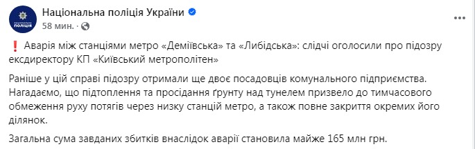 На основании полученных доказательств экс-начальнику метро сообщили о подозрении по ч. 2 ст. 367 (служебная халатность) Уголовного кодекса Украины.  Подозрение ему послали на официальные адреса регистрации и проживания, поскольку он не явился на вызовы. Сейчас его разыскивают.