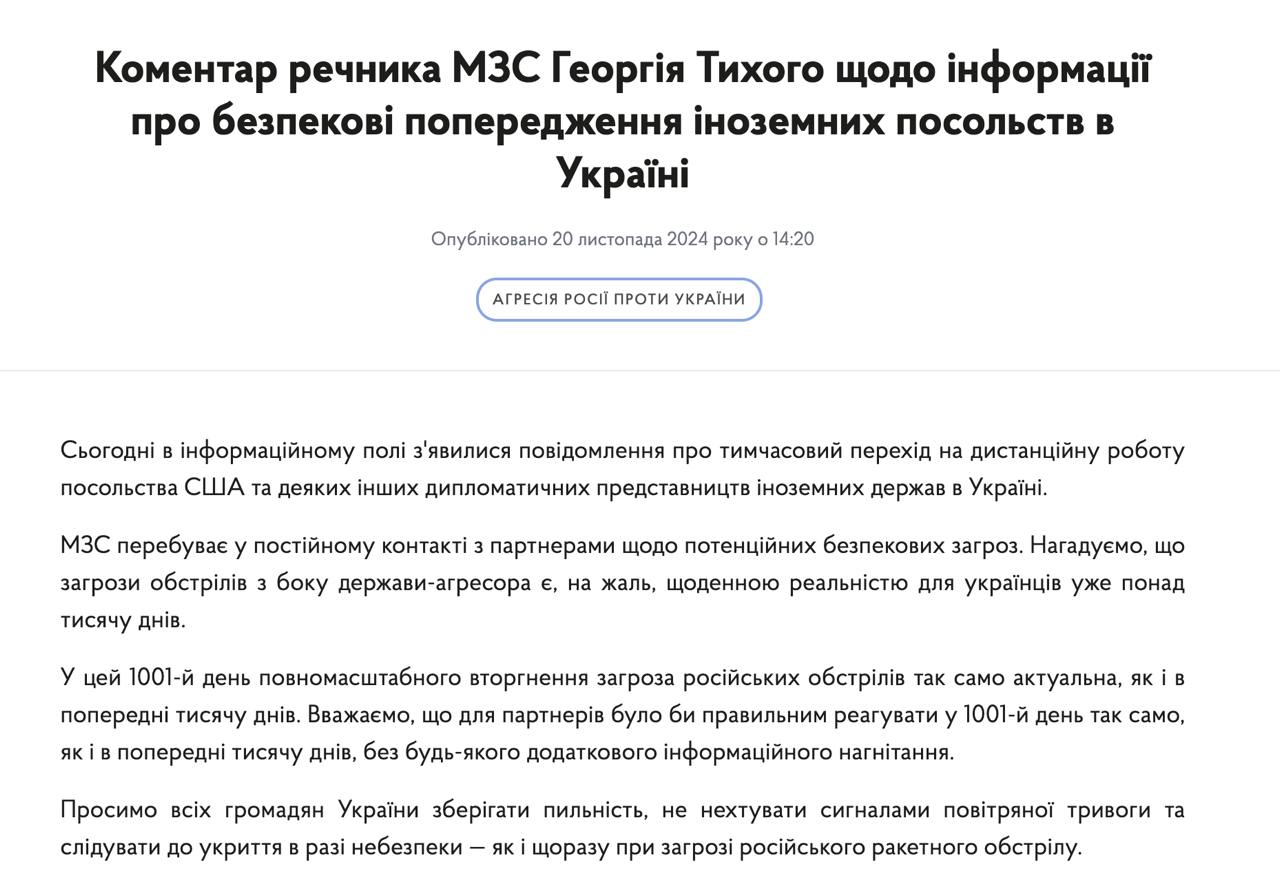 8.52 В Украине прокомментировали предупреждения посольства США о масштабном ударе сегодня, 20 ноября.
