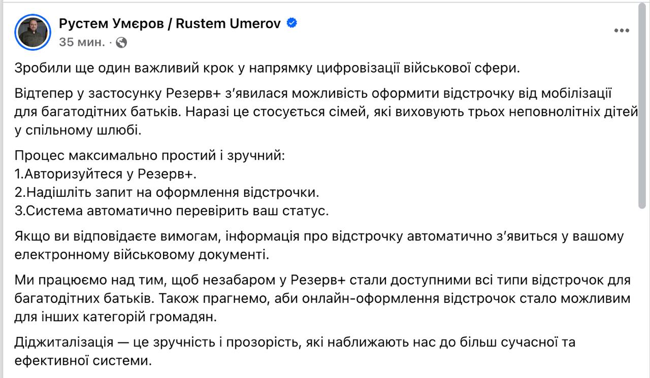 17.09 В "Резерв+" появилась возможность оформить отсрочку от мобилизации для многодетных родителей, сообщает Минобороны.