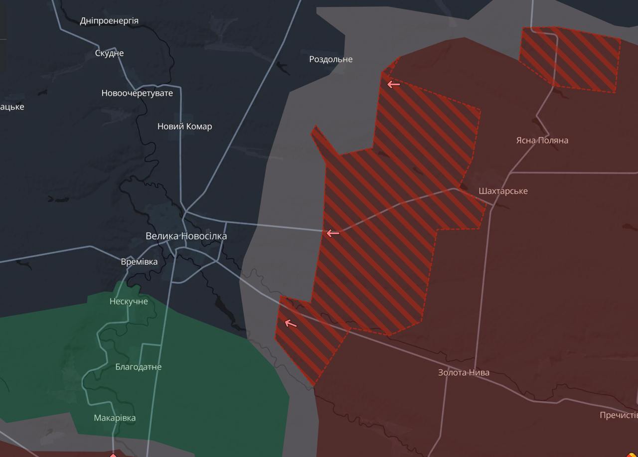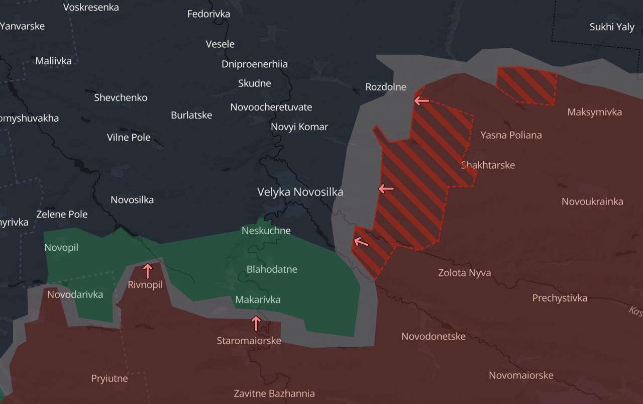 На левом фланге (к северо-востоку от Великой Новоселки) россияне «решают проблему» Раздольного и движутся на запад к селу Новый Комар.