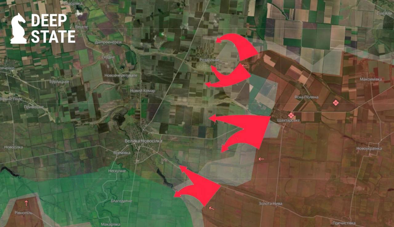 08:27 Российские войска вчера прорвались к окраинам Великой Новоселки в Донецкой области. Там наступили "крайне тяжелые времена", пишет украинский военный паблик Deep State.