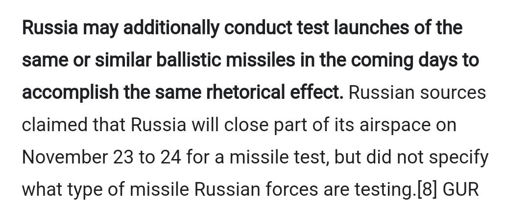 "Россия может дополнительно провести испытательные пуски тех же или подобных баллистических ракет в ближайшие дни, чтобы достичь того же риторического эффекта. Российские источники заявили, что Россия закроет часть своего воздушного пространства 23-24 ноября для испытания ракеты, но не уточнили, какой тип ракеты испытывают российские силы", - говорится в отчёте ISW.