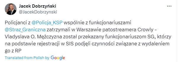 "Полицейские задержали в Варшаве трэш-стримера Кроули Владислава О. Мужчину передали сотрудникам Пограничной службы, которые предприняли действия, связанные с его выдворением из Республики Польша", - сказано в посте.