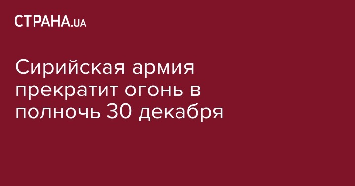 Командование ВС Сирии заявило, что его армия прекратит боевые действия по всей территории Сирии, начиная с 00:00 мск 30 декабря. На заявление командования ссылается агентство SANA.