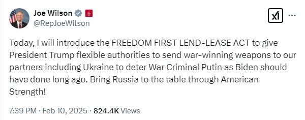 Член Палаты представителей от Республиканской партии Джо Уилсон из Южной Каролины внес в Конгресс США законопроект о ленд-лизе для Украины и Израиля.