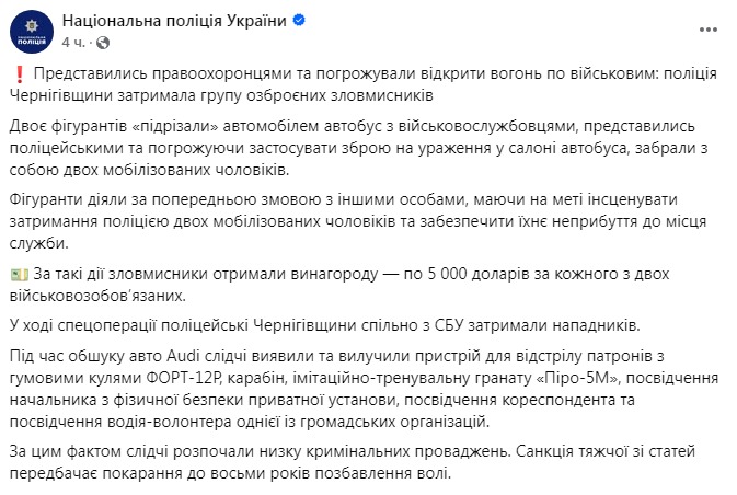 Происшествие произошло 9 февраля около 02:00. Тогда в полицию поступила информация от военных о том, что в Чернигове водитель легкового автомобиля Audi подрезал на дороге автобус с мобилизованными. Из легковушки вышли двое молодых людей в гражданской одежде, которые представились полицейскими и показали удостоверение.