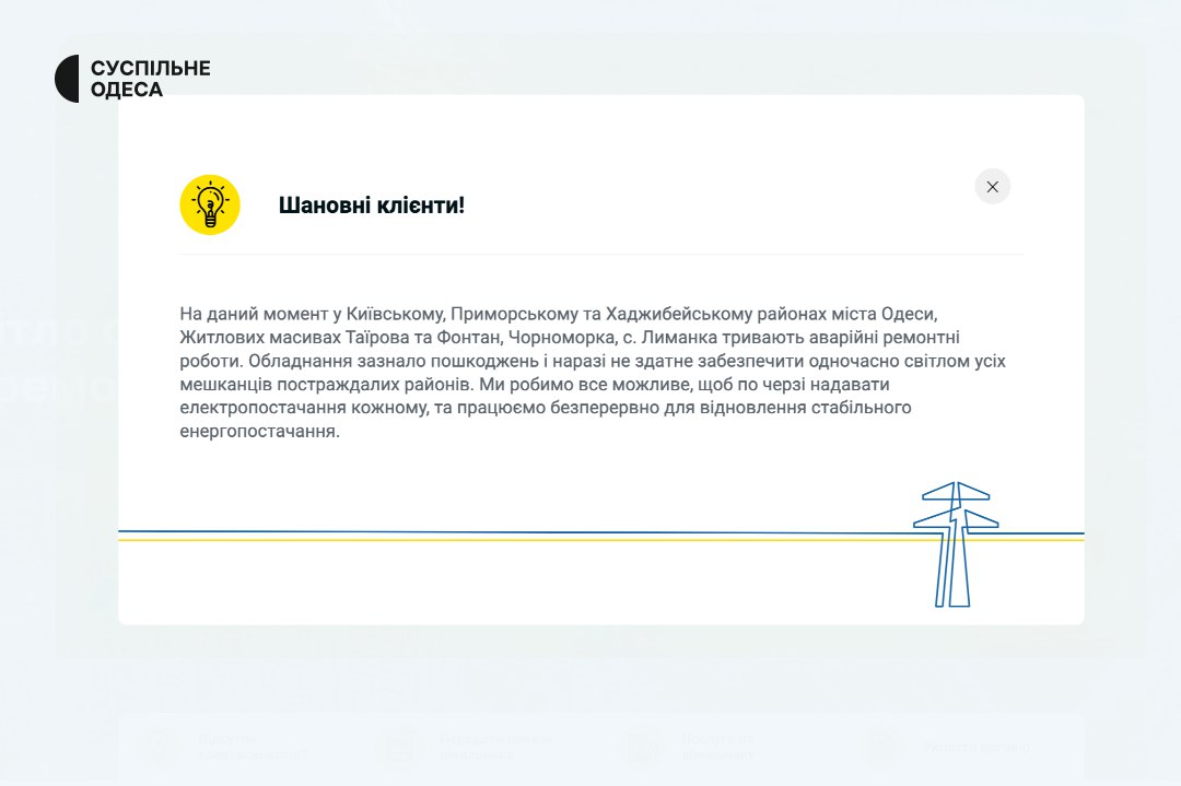 23.24 В Киевском, Приморском и Хаджибейском районах Одессы, жилых массивах Таирова и Фонтан, Черноморка, с. Лиманка идут аварийные ремонтные работы, сообщили в ДТЭК Одесские электросети после атаки «Шахедов».