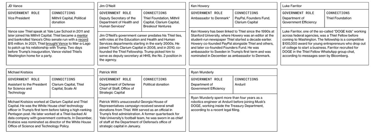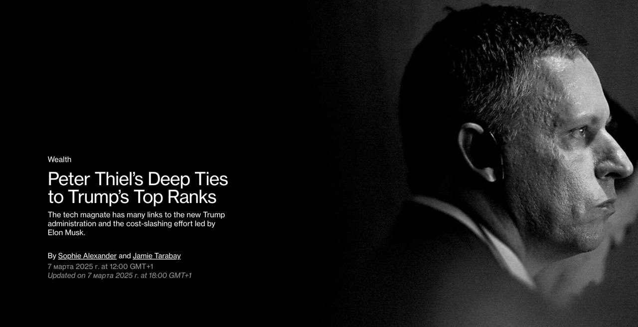 "Более десятка людей, связанных с Тилем, включая нынешних и бывших сотрудников его компаний, а также людей, которые помогли управлять его состоянием или извлекали выгоду из его инвестиций и благотворительных пожертвований, были включены в администрацию Трампа", - пишет издание.