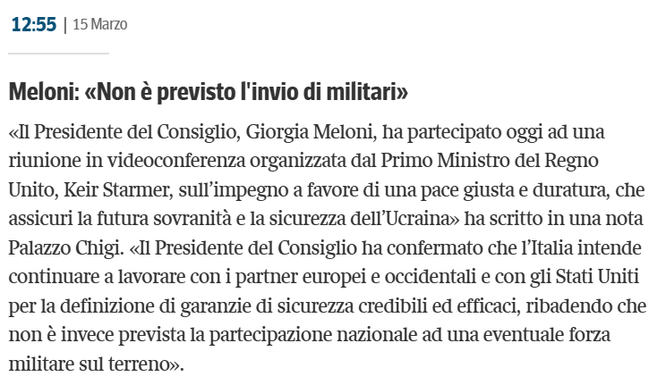 14:45 Италия не планирует отправлять своих военных миротворцев в Украину. Об этом заявила премьер-министр Италии Джорджа Мелони, пишет Corriere della Sera.