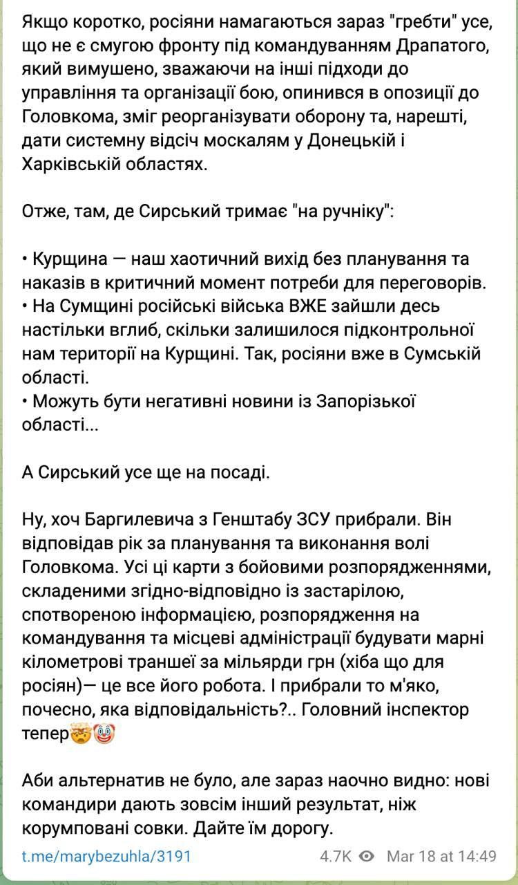 Он говорит, что "ключевые решения принимаются военными", а Зеленский "оценивает, какие решения принимает, но я не думаю, что президент непосредственно настаивал, чтобы это (выход с Курщины - Ред.) было именно так".