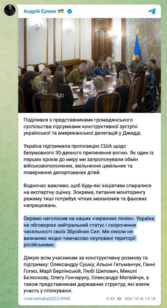 "Отдельно отметил наши «красные линии». Украина не обсуждает нейтральный статус и сокращение численности своих вооруженных сил. Мы никогда не признаем никакие временно оккупированные территории русскими", - заявил глава ОП на встрече с "представителями гражданского общества", на которой он "поделился итогами конструктивной встречи украинской и американской делегаций в Джидде".