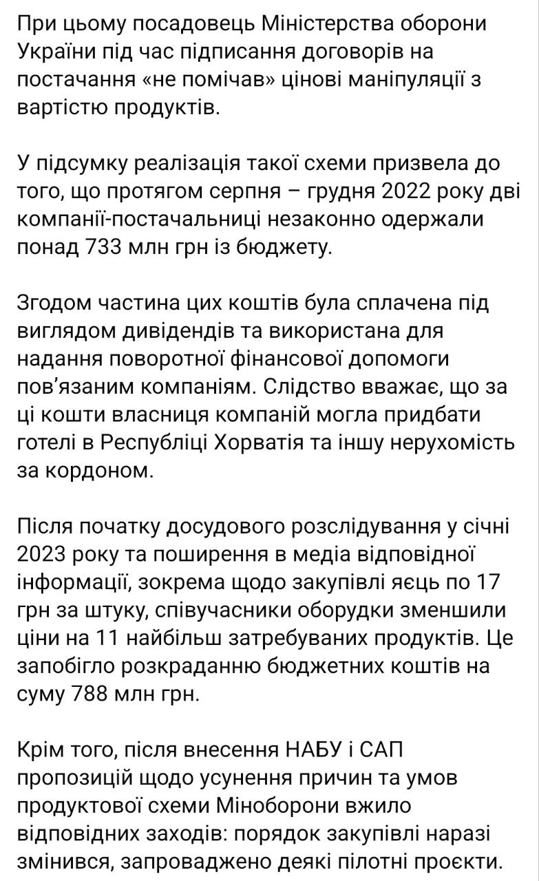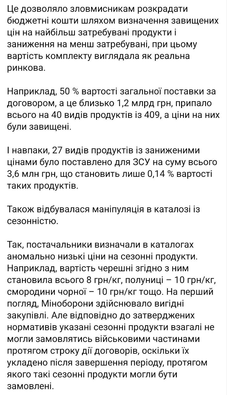 "Установлено, что в течение 2022-2023 годов Министерство обороны обеспечивало военных продуктами питания путем закупки у субъектов хозяйствования услуги по организации питания. Суть этой услуги заключалась в закупке комплекта продуктов согласно каталогу, содержавшему 409 наименований. То есть Минобороны закупало не отдельные продукты из 409, которые есть в каталоге, а все 409, стоимость которых формировала цену комплекта. Это позволяло злоумышленникам разворовывать бюджетные средства путем определения завышенных цен на наиболее востребованные продукты и занижения на менее востребованные, при этом стоимость комплекта выглядела как реальная рыночная.