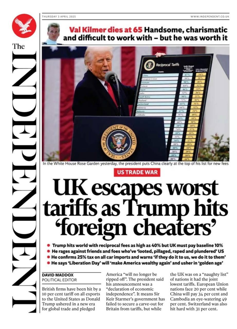 "Трамп развязывает вихрь пошлин против мирового порядка", "Трамп против всего мира", "Трамп развязывает торговую войну", "Трамп наложил на Евросоюз пошлину в 20%", "Великобритания избежала худших тарифов, поскольку Трамп бьет "иностранных мошенников"".