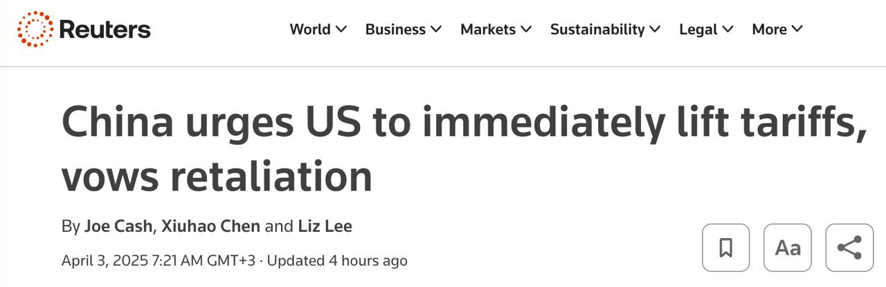 Напомним, президент США Дональд Трамп объявил, что против Китая будут введены пошлины в размере 34% в дополнение к 20%, которые он ввел ранее в этом году. Общий размер пошлин составит 54% и приблизится к цифре в 60%, которой он угрожал в ходе предвыборной кампании.