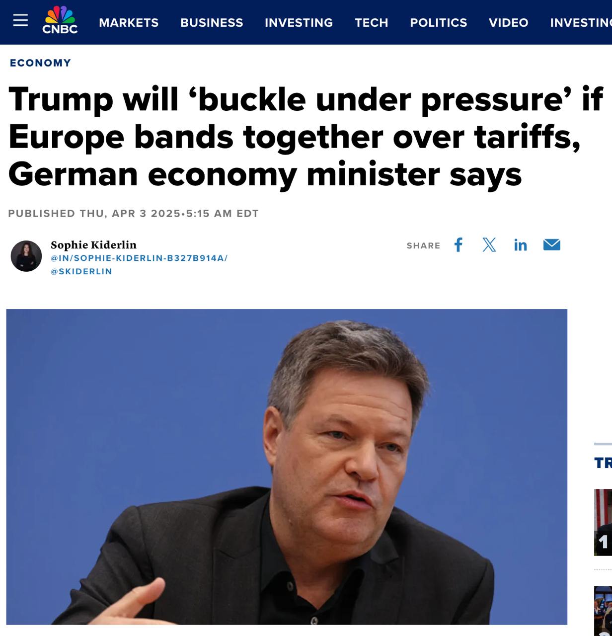 Также министр экономики Германии Роберт Хабек угрожает Трампу, что Европа объединится с другими странами, чтобы ответить на пошлины США.