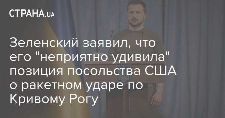 Президент Владимир Зеленский заявил, что его "неприятно удивила" позиция посольства США в Украине по поводу вчерашнего ракетного удара по Кривому Рогу.