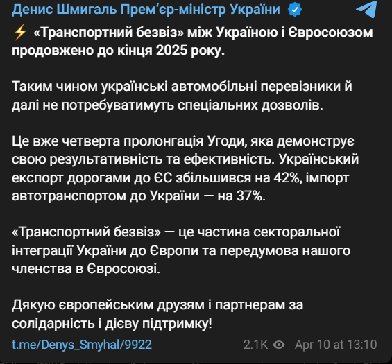 "Это уже четвертая пролонгация Соглашения, демонстрирующая свою результативность и эффективность. Украинский экспорт по дорогам в ЕС увеличился на 42%, импорт автотранспортом в Украину - на 37%", - пишет премьер.