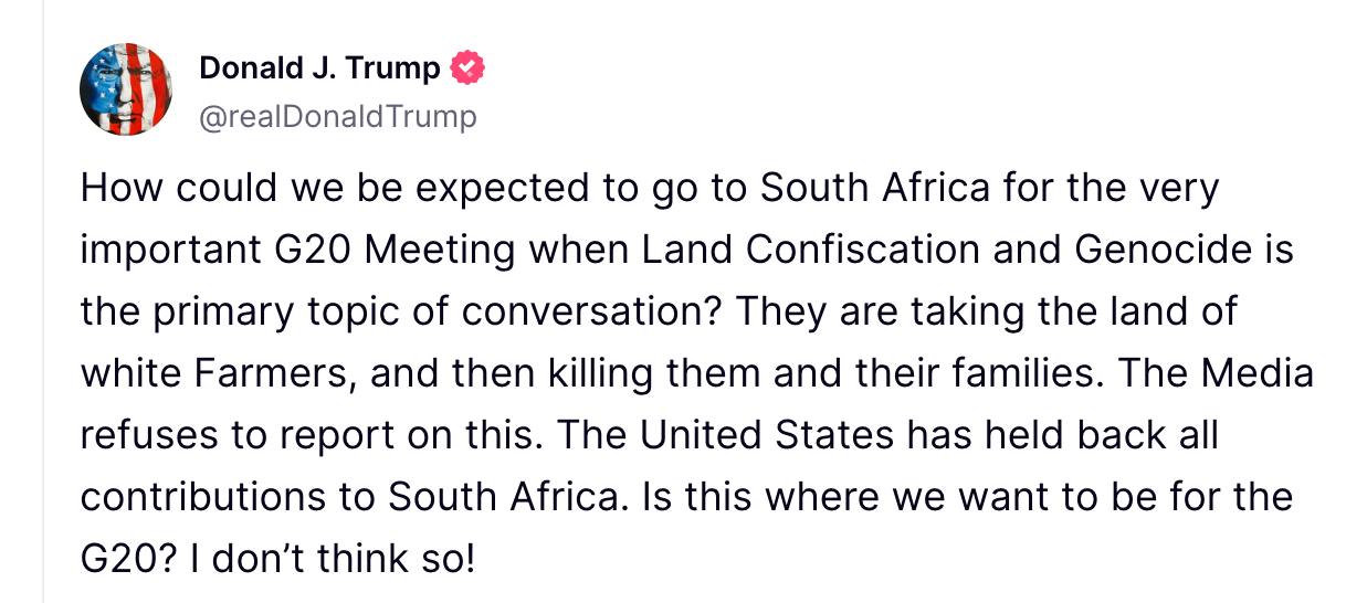 "Как можно ожидать, что мы поедем в Южную Африку на очень важную встречу G20, когда конфискация земель и геноцид являются главной темой разговора? Они забирают землю белых фермеров, а затем убивают их и их семьи. СМИ отказываются сообщать об этом. Соединенные Штаты остановили все взносы в Южную Африку. Хотим ли мы быть именно там для G20? Я так не думаю!", - написал американский президент.