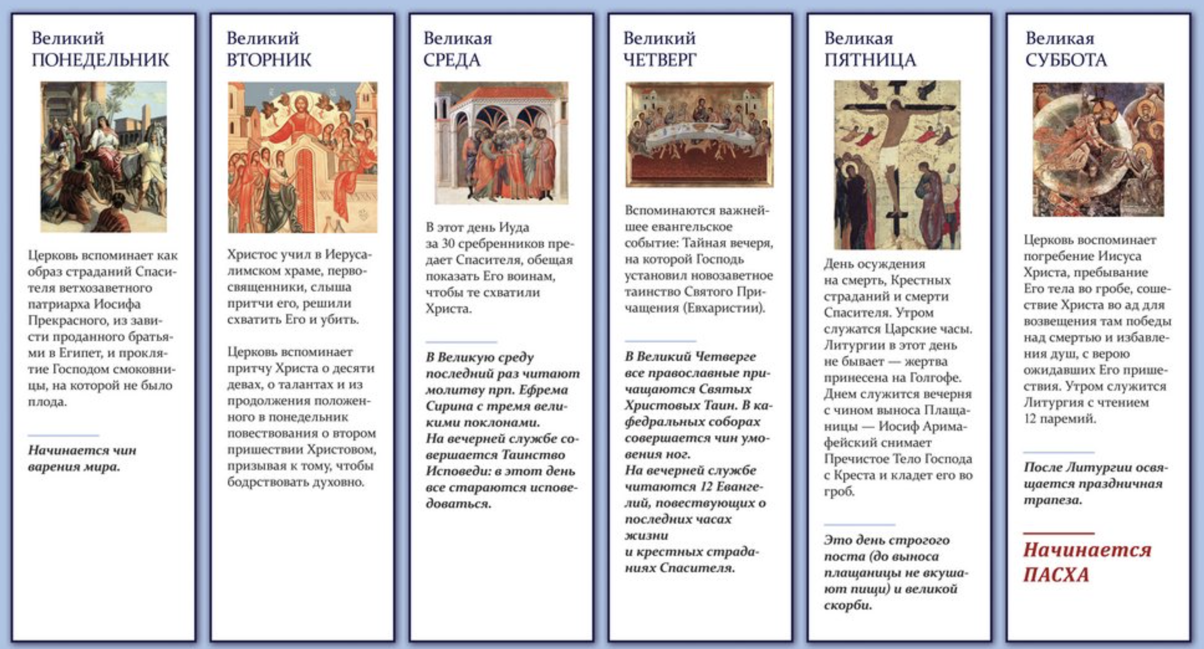 Каждый день этой недели называется Великим и имеет особое духовное значение, посвящённое последним дням земной жизни Иисуса Христа, Его страданиям (отсюда и название "Страстная"), распятию и погребению.