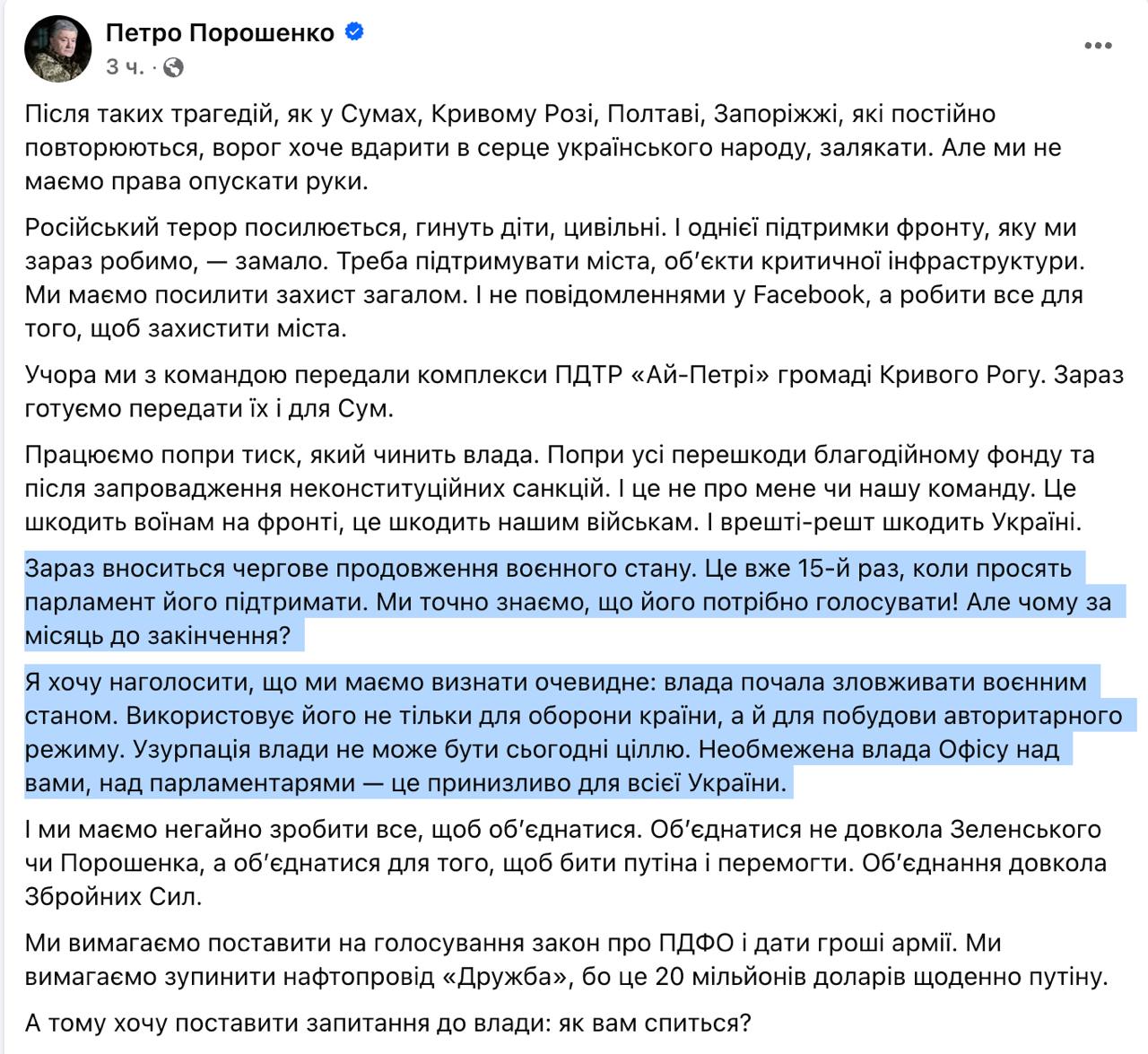 "Сейчас вносится очередное продление военного положения. Мы точно знаем, что его нужно голосовать! Но почему за месяц до истечения? Мы должны признать очевидное: власть начала злоупотреблять военным положением. Использует его не только для обороны страны, но и для построения авторитарного режима. Узурпация власти не может быть сегодня целью", - написал Порошенко.