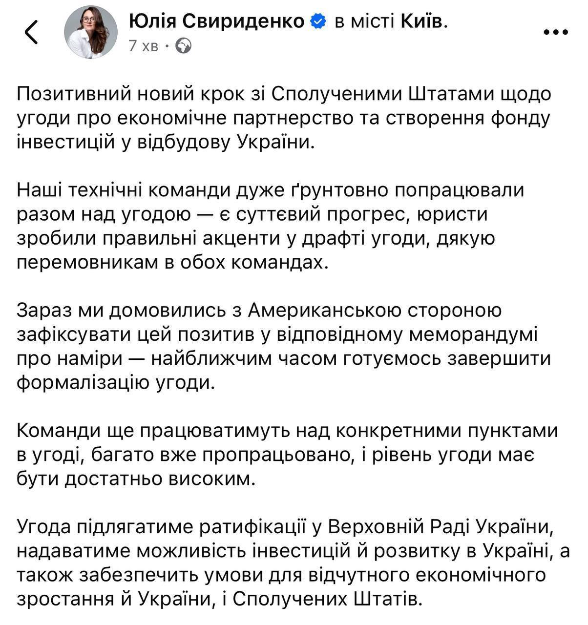 "Сейчас мы договорились с американской стороной зафиксировать этот позитив в соответствующем меморандуме о намерениях — в ближайшее время готовимся завершить формализацию сделки", - сказано в публикации Свириденко.