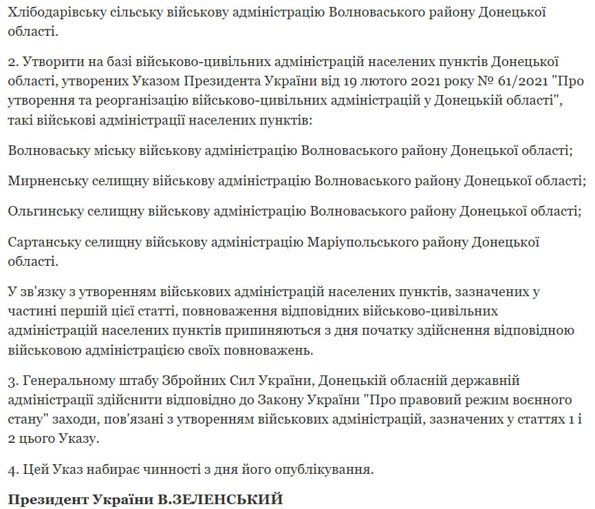 Всего Зеленский образовал 10 военных администраций в Донецкой области. В частности, в Мариупольском районе созданы: