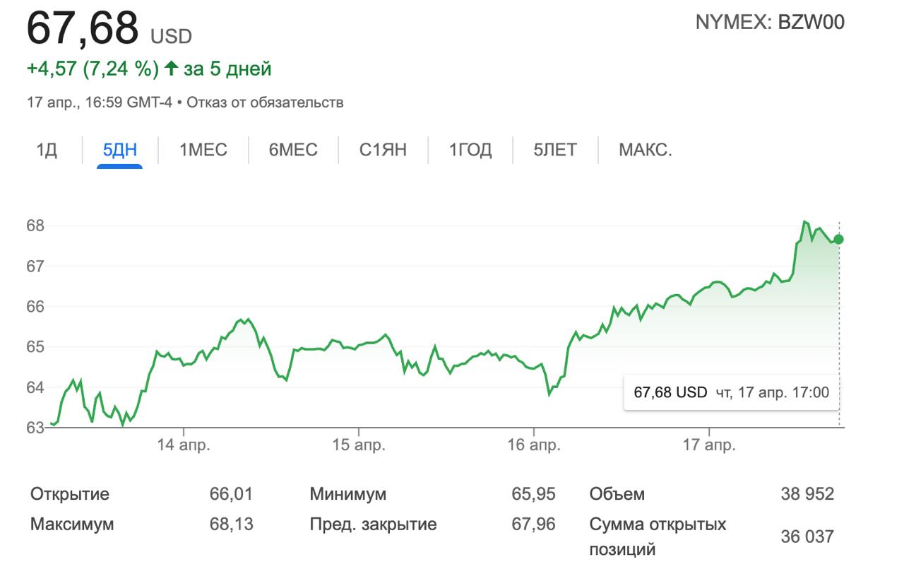 Марка Brent подорожала на 7% за последние 5 дней и стоит более 67 долл. за баррель. WTI - на 3% до 67,9 долл.