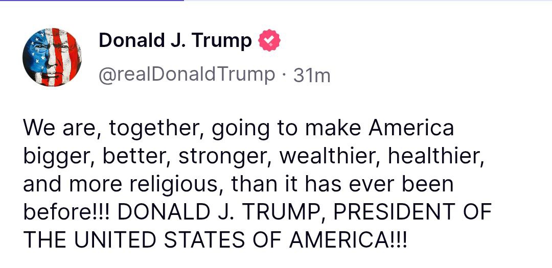 "Мы вместе сделаем Америку больше, лучше, сильнее, богаче, здоровее и религиознее, чем когда-либо прежде!" – написал президент США.