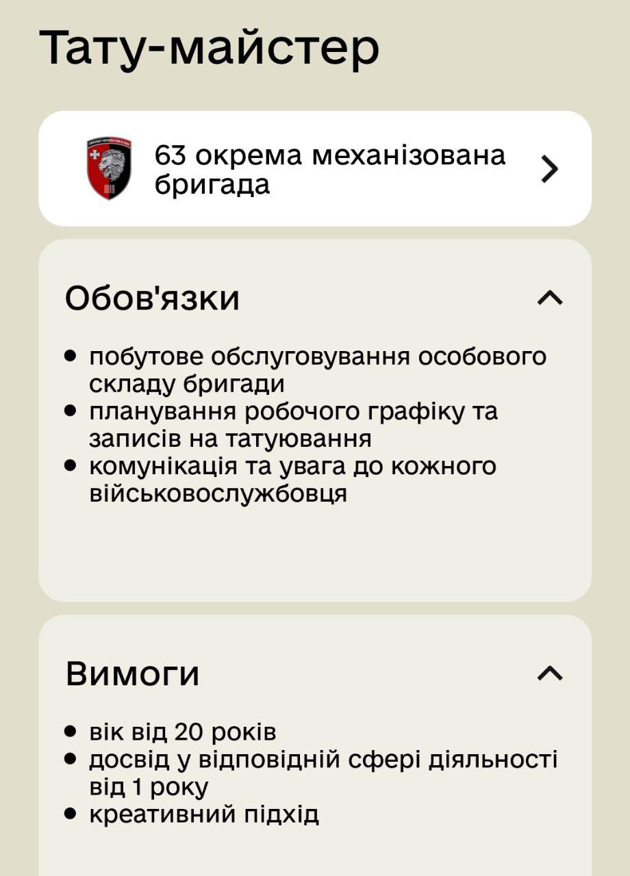 63-я бригада ВСУ ищет тату-мастера для бытового обслуживания личного состава