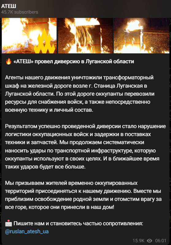 11:30 Представители партизанского движения "АТЕШ" устроили диверсию на железной дороге возле оккупированного города Станица Луганская Луганской области.