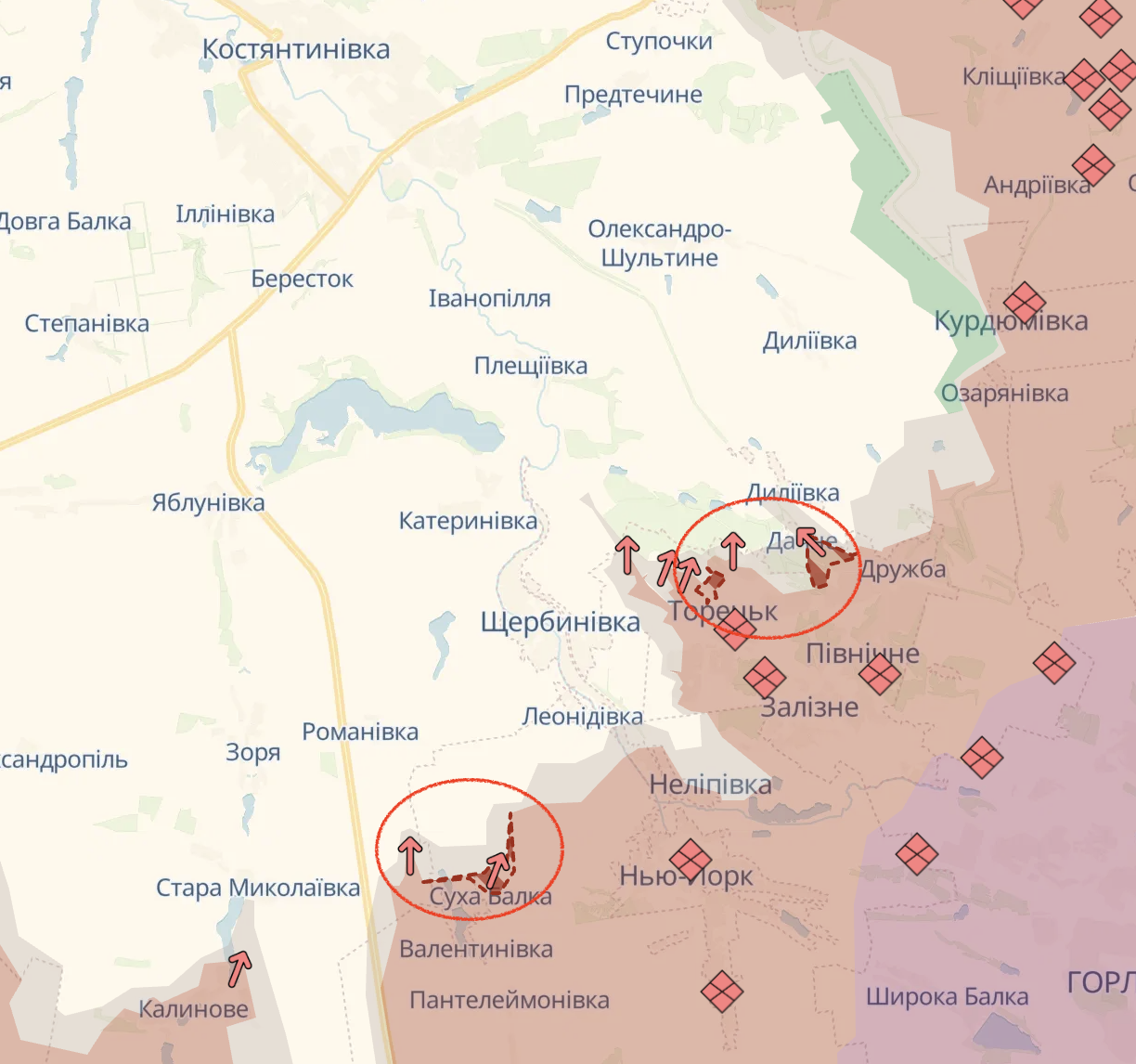 Россияне захватили село Сухая Балка к югу от Константиновки. А также продвинулись в соседнем Торецке и Дачном.