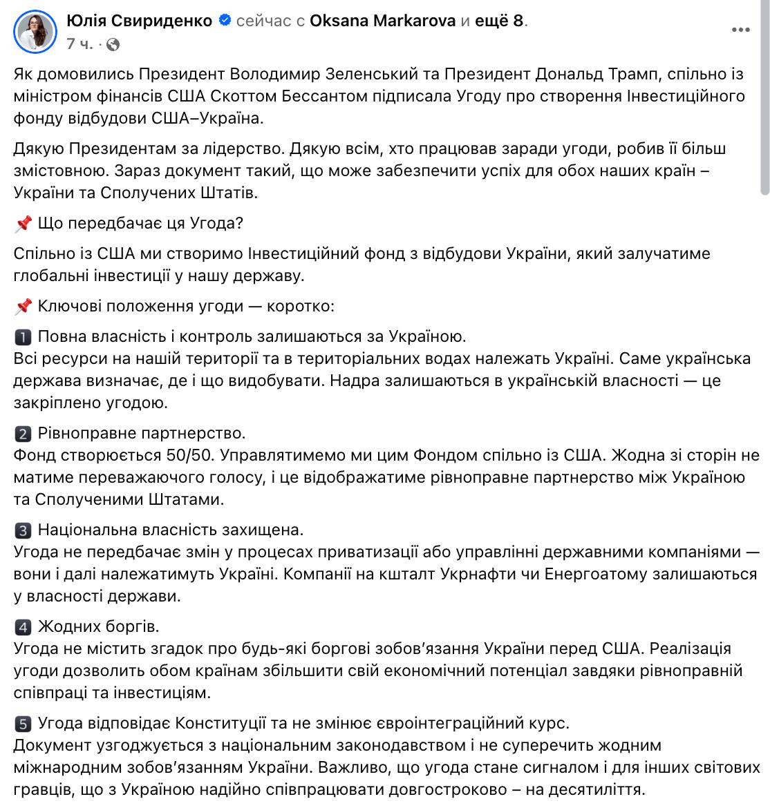 "Благодаря неустанным усилиям президента Трампа по обеспечению прочного мира, рад сообщить о подписании сегодня исторического соглашения об экономическом партнёрстве между Соединёнными Штатами и Украиной, предусматривающего создание Инвестиционного фонда восстановления Украины.