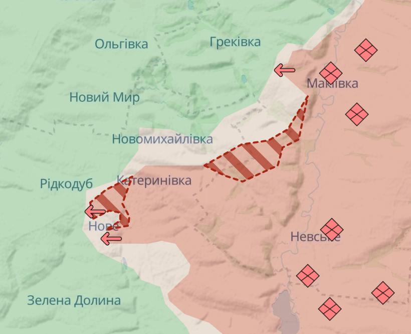 Если не считать Курскую область, то 85% остальных продвижений РФ сосредоточены в Донецкой области. Больше всего россияне продвинулась на участке фронта между Торецком и Покровском (в районе Сухой Балки и Калинового), а также около Константинополя и Разлива к западу от Курахово.