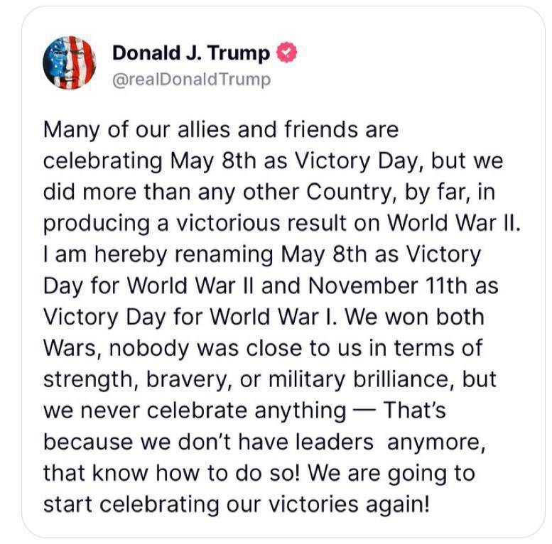 "Многие наши союзники и друзья отмечают 8 мая как День Победы, но именно мы сделали для победы во Второй мировой войне больше, чем любая другая страна - несравнимо больше. Сегодня я объявляю 8 мая Днем Победы во Второй мировой войне, а 11 ноября - Днем Победы в Первой мировой. Мы победили в обеих войнах, никто даже не приблизился к нам по силе, храбрости и военному мастерству, но мы больше ничего не празднуем - потому что у нас больше нет лидеров, которые умеют это делать! Пришло время снова начать праздновать наши победы!", - заявил Трамп.