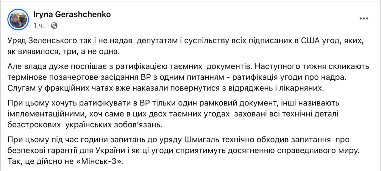 "Правительство Зеленского так и не предоставило депутатам и обществу все подписанные в США соглашения, которых, как оказалось, три, а не одно. Но власть очень спешит с ратификацией тайных документов. При этом хотят ратифицировать в ВР только один рамочный документ, остальные называют имплементационными, хоть именно в этих двух тайных соглашениях спрятаны все технические детали бессрочных украинских обязательств", - пишет Геращенко.