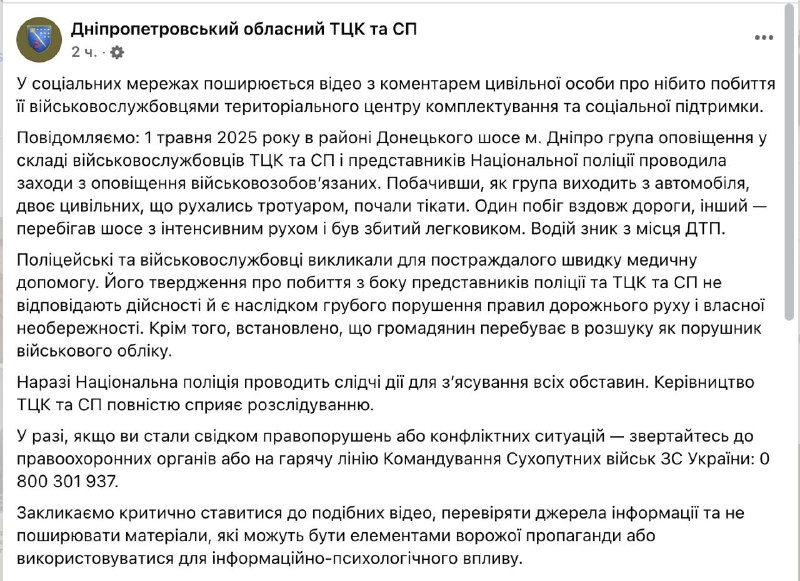 "В социальных сетях распространяется видео с комментарием гражданского лица о якобы избиении его военнослужащими территориального центра комплектования и социальной поддержки. Сообщаем: 1 мая 2025 года в районе Донецкого шоссе Днепра группа оповещения в составе военнослужащих ТЦК и СП и представителей Национальной полиции проводила мероприятия по оповещению военнообязанных. Увидев, как группа выходит из автомобиля, двое двигавшихся по тротуару гражданских начали бежать. Один побежал вдоль дороги, другой перебегал шоссе с интенсивным движением и был сбит легковушкой. Водитель скрылся с места ДТП. Полицейские и военнослужащие вызвали для пострадавшего скорую помощь. Его утверждения об избиении со стороны представителей полиции и ТЦК и СП не соответствуют действительности и являются следствием грубого нарушения правил дорожного движения и неосторожности. Кроме того, установлено, что гражданин находится в розыске как нарушитель военного учета. Национальная полиция проводит следственные действия для выяснения всех обстоятельств. Руководство ТЦК и СП полностью способствует расследованию", - сказано в публикации.