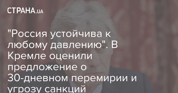 Спикер Кремля также прокомментировал предложение установить перемирие на 30 дней и угрозы стран Запада ввести санкции против РФ в случае отказа от остановки боевых действий. Он заявил, что Кремль изучит это предложение, и добавил, что "Россия устойчива к любому давлению".