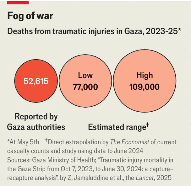 Такие данные приводит британский журнал The Economist на основании сопоставления трёх независимых списков погибших: от Министерства здравоохранения Газы, онлайн-опросов и некрологов в социальных сетях.