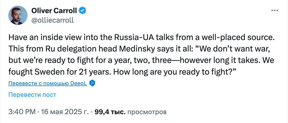 16:54 Журналист The Economist Оливер Кэррол сообщает, что Мединский задал такой вопрос на переговорах с Украиной: "Мы не хотим войны, но готовы воевать ещё год, два, три - столько, сколько потребуется. Мы воевали со Швецией 21 год. А вы сколько готовы воевать?"