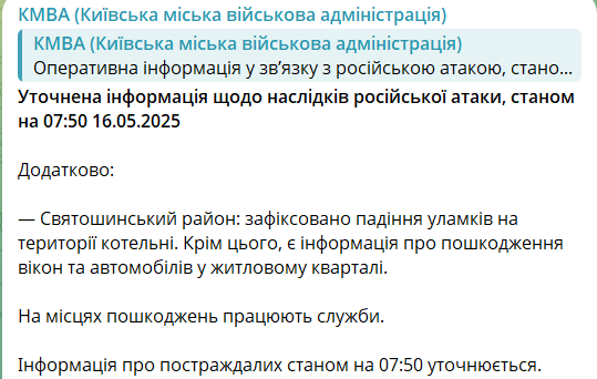 08:16 Киев с утра атаковали дроны. В КГВА сообщают, что зафиксировано падение обломков на территории котельной в Святошинском районе. Кроме того, есть информация о повреждениях окон и автомобилей в жилом квартале.