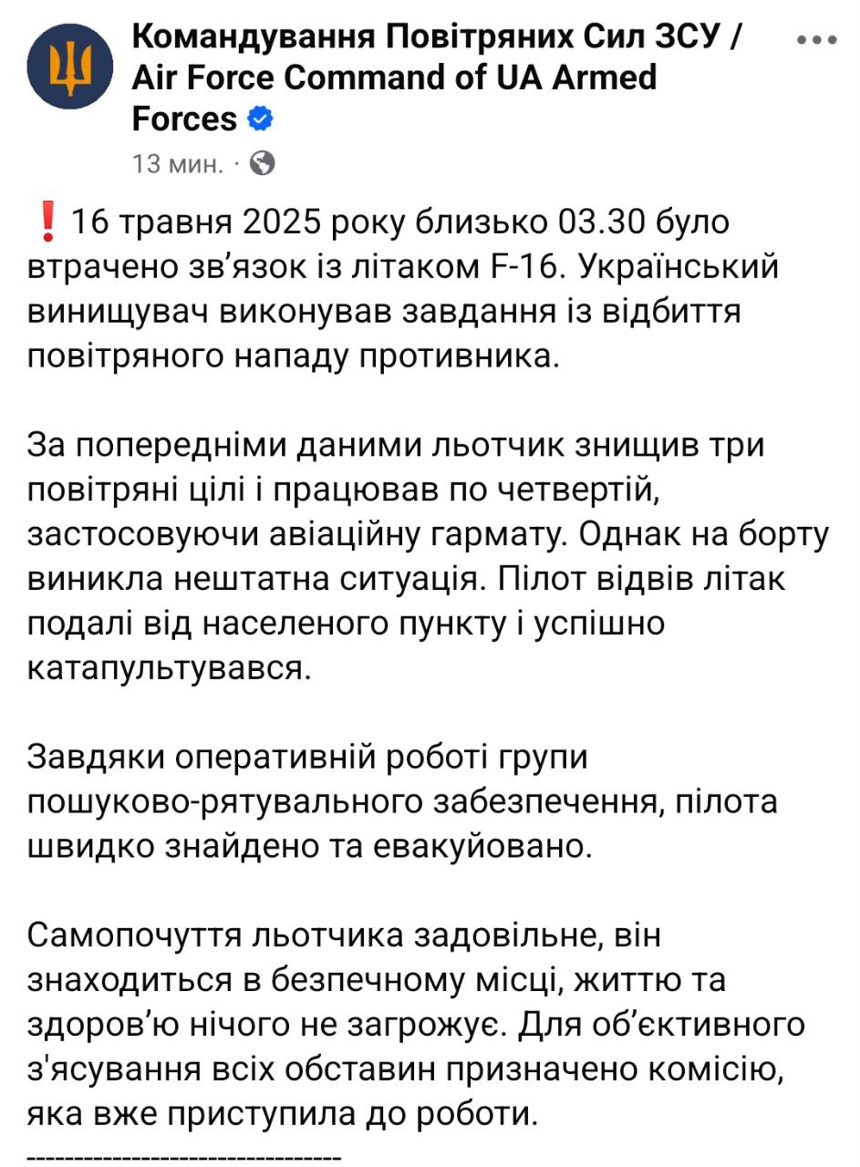 08:05 Украина потеряла ещё один истребитель F-16, сообщают Воздушные силы ВСУ.