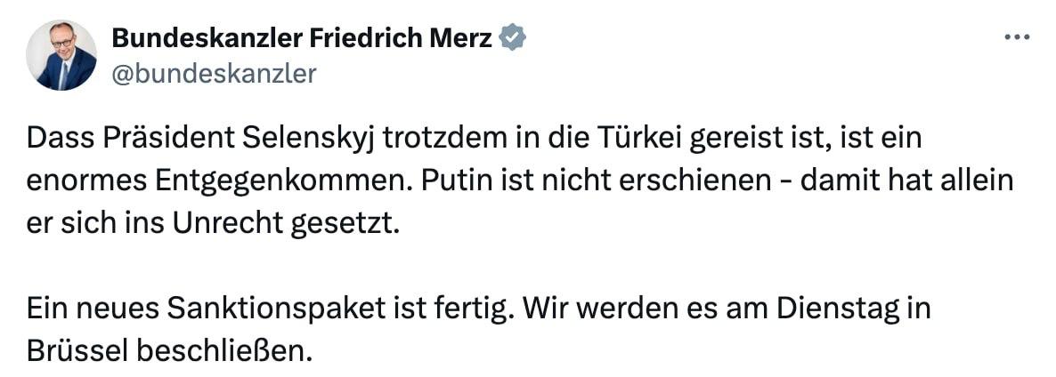 Канцлер Германии Мерц также обвинил Москву в срыве переговоров, но отметил, что на переговорах произошел "очень маленький, но первый положительный сигнал".